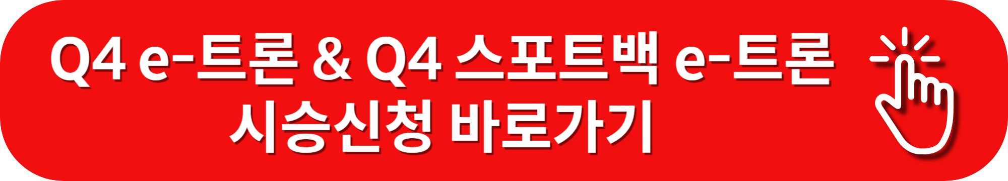 아우디코리아에서 지난 6월 19일, 전기차 SUV Q4 e-트론과 Q4 스포트백 e-트론 2023년형의 사전계약 접수를 받는다고 밝혔습니다. 82 kWh 용량의 리튬 이온 배터를 탑재한 두 모델은 합산 최고 출력 204마력, 순간 출력 31.6kg·m을 발휘한다고 합니다. 차에 관심을 많이 두고 계신 분이라면 많이들 궁금해하실 텐데요. 차량에 대해 알아보고 무엇보다 몸으로 먼저 느껴보고 싶은 분들을 위해 시승신청 바로 가봅니다!