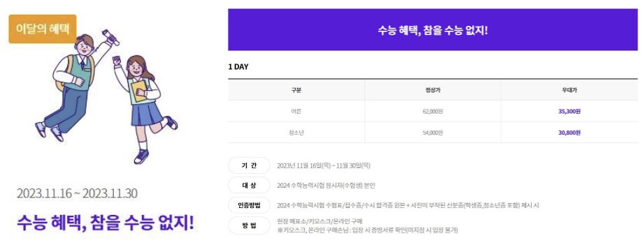 ※수험생 할인 우대를 위해서는 2023 수능 수험표, 수시합격증 등 증명할 수 있는 서류 매표소에 제시 필요!